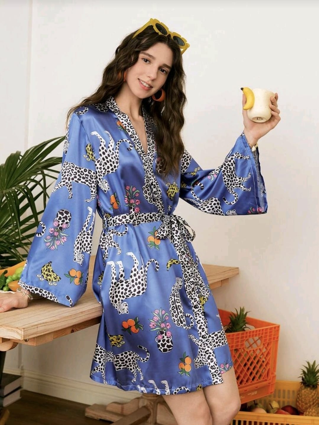 Esta bata corta tipo kimono en tela satinada suave y liviana tiene una estampa original de leopardos con detalles florales que la hacen moderna y súper canchera.