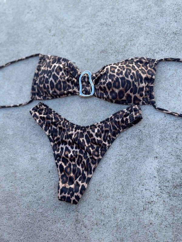 Bikini de dos piezas en color marrón con estampa animal print tipo leopardo, un diseño clásico y canchero que nunca pasa de moda.