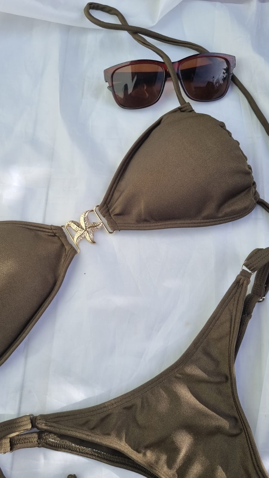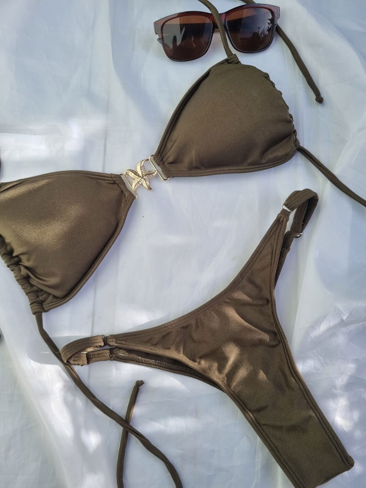 El detalle estrella (literalmente) es su avío central en forma de estrella de mar en tono dorado, que aporta un toque sofisticado y veraniego.