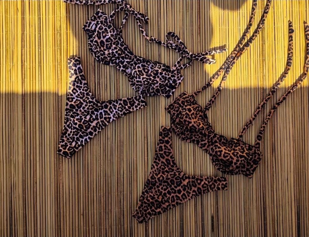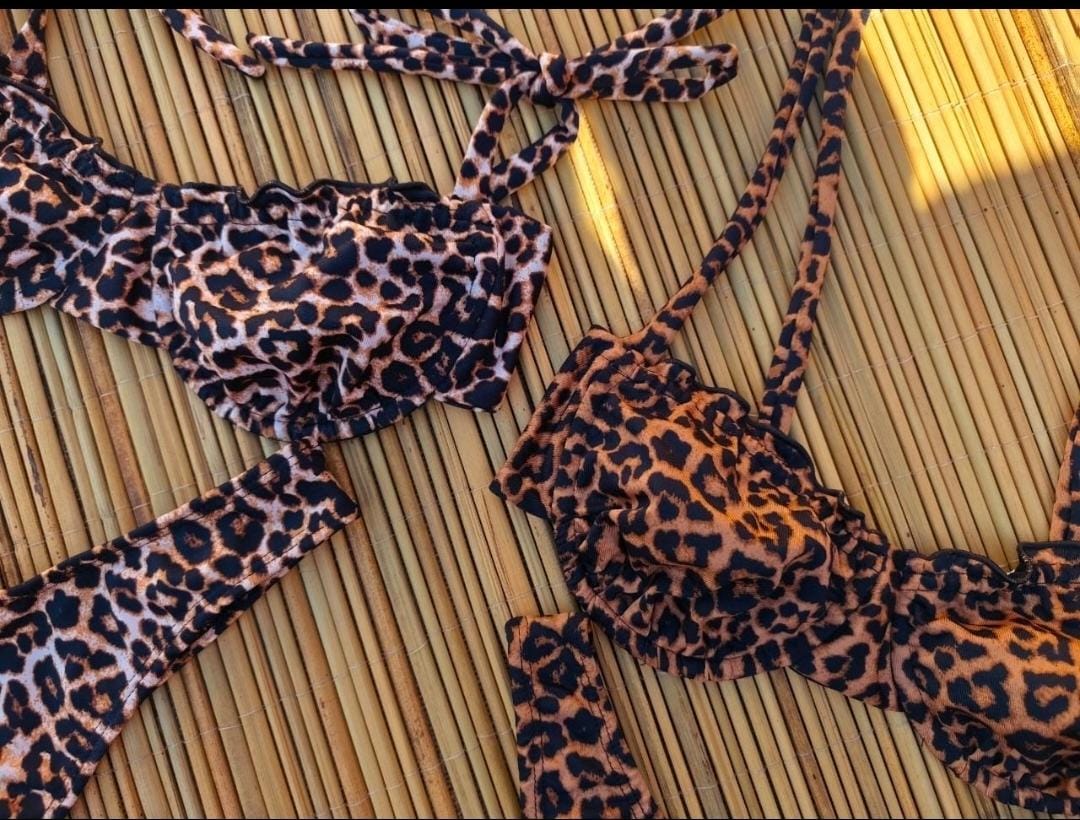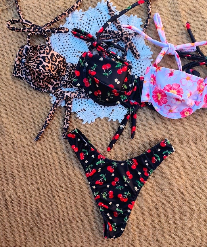 Bikini de dos piezas con diseño femenino y sostén estructurado que realza y sostiene el busto de manera natural. El corpiño cuenta con aro y tirantes regulables que se atan en los hombros, permitiendo ajustar el calce según tu comodidad y tipo de cuerpo.