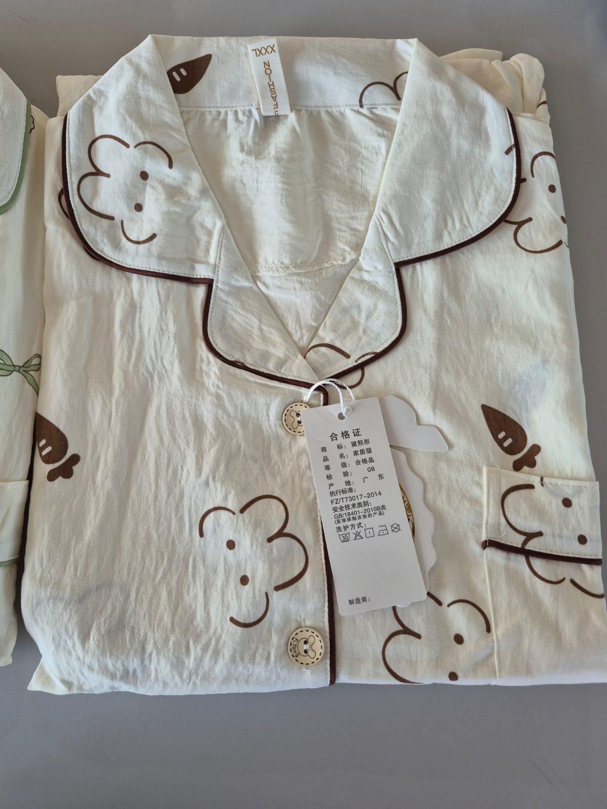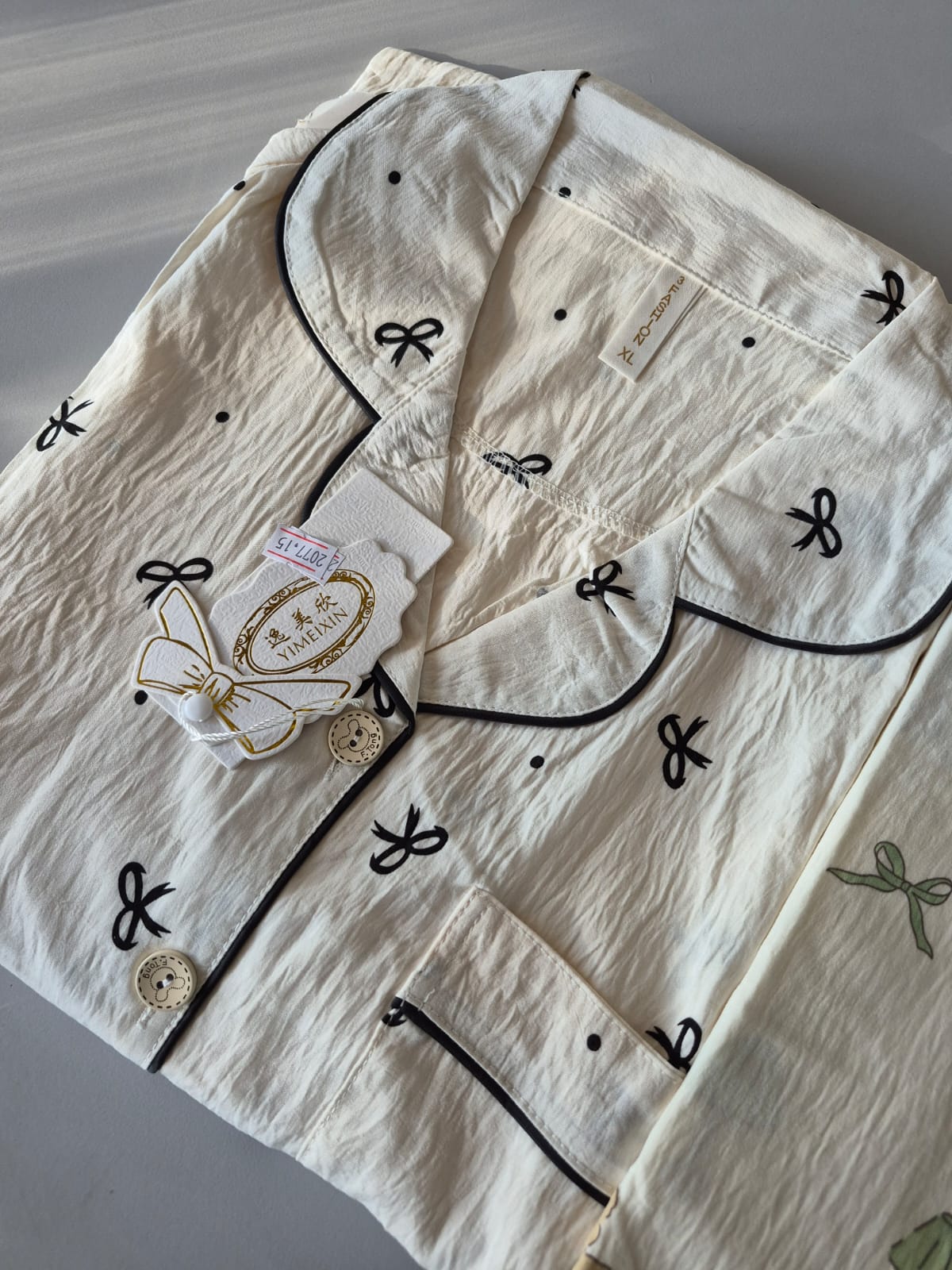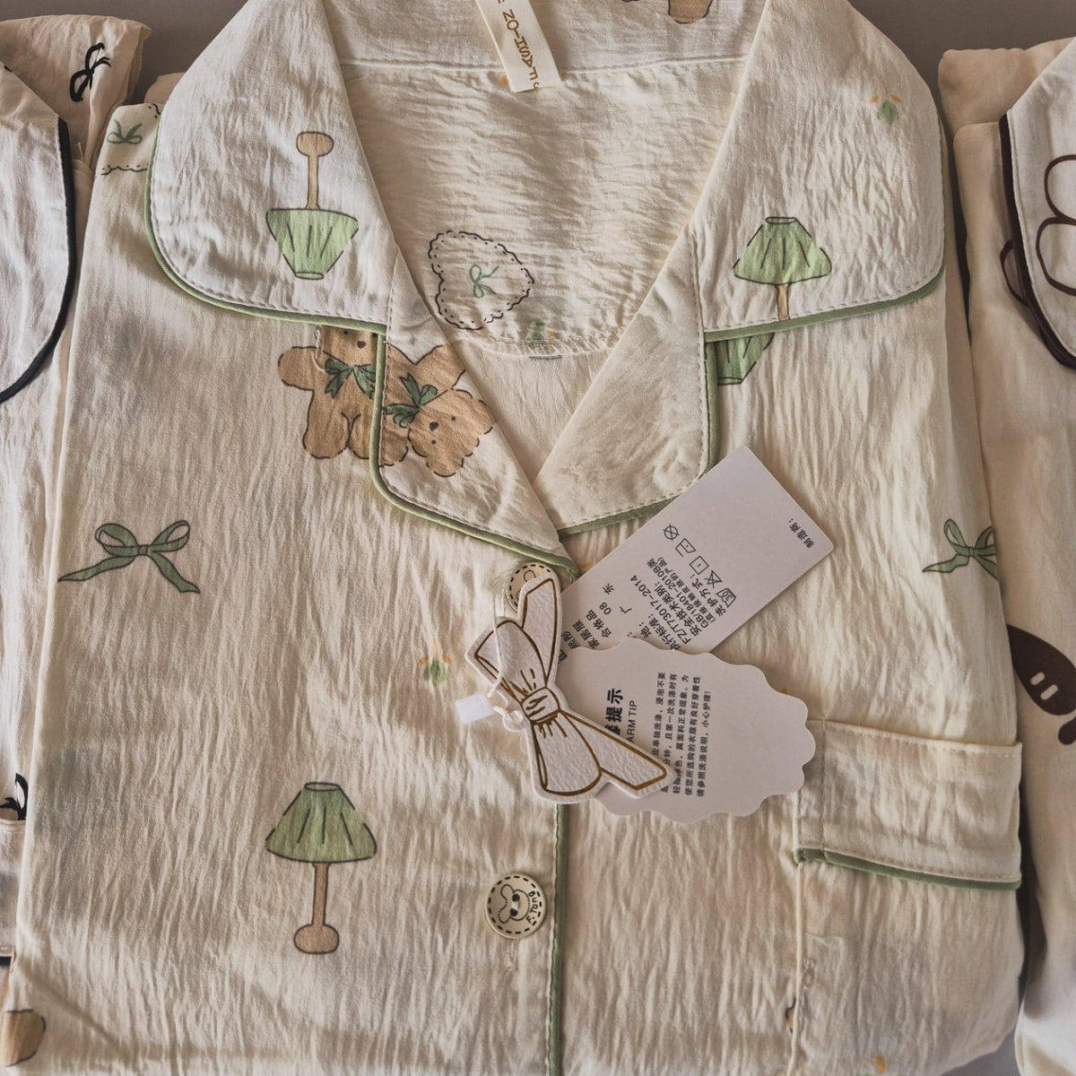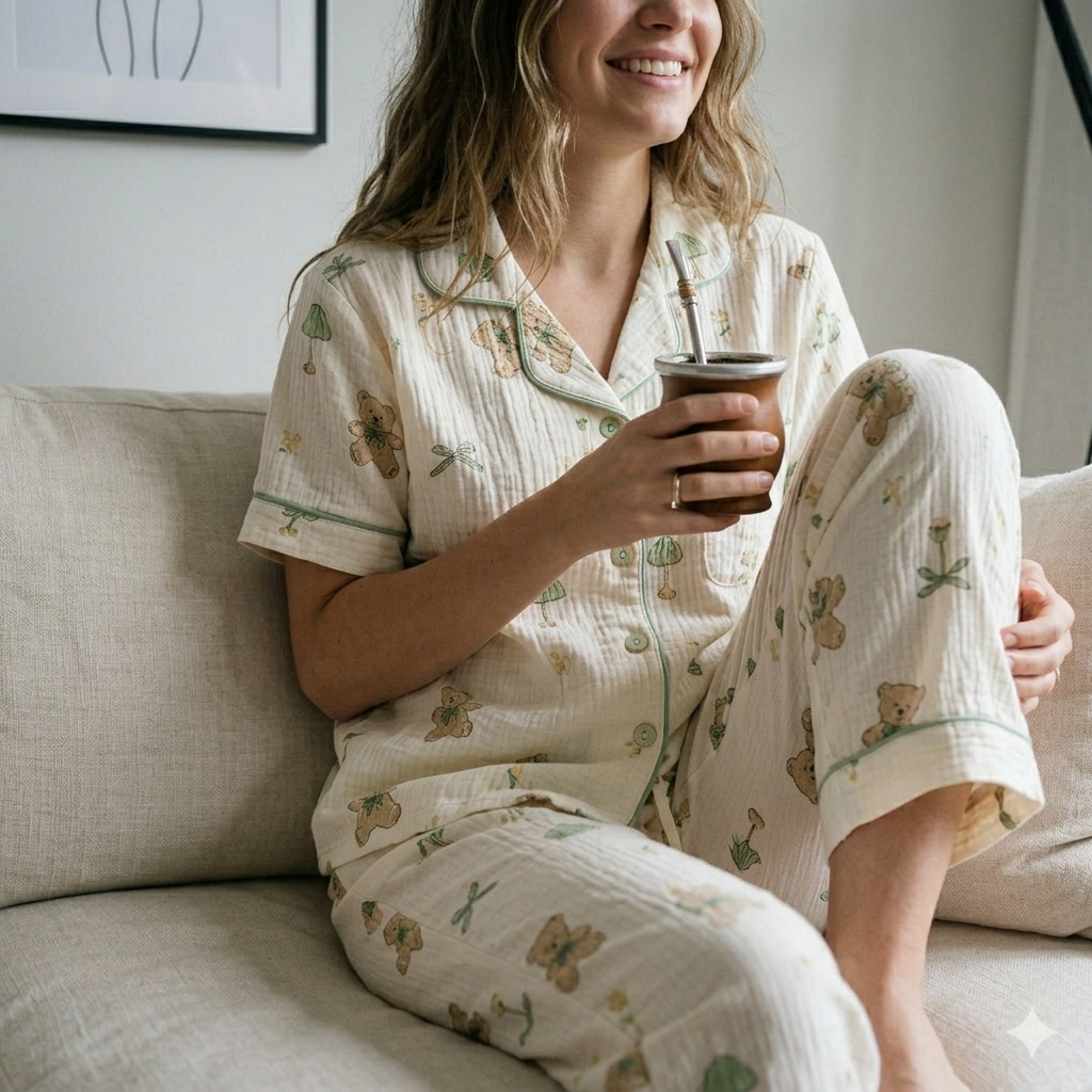 Este conjunto incluye camisa de manga corta con botones y pantalón largo, confeccionado en tela tipo algodón texturizado, ideal para usar todo el año. Su delicado estampado de ositos y detalles en tonos verdes aportan un toque dulce y relajado, perfecto para quienes buscan comodidad sin resignar estilo.